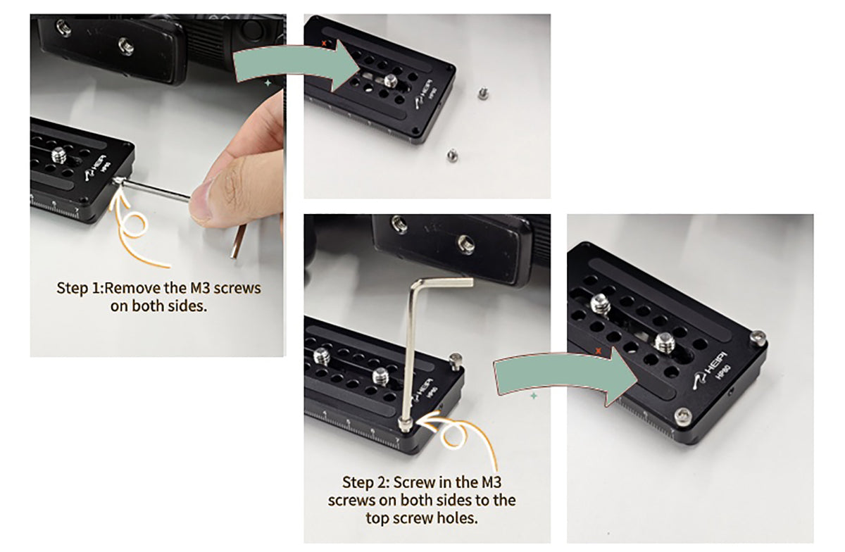 This plate can effectively prevent your camera from twisting. Just remove the M3 screws from the sides and securely fasten them into the top screw holes. (Note: This function is only for lenses with a single hole on their lens foot.)